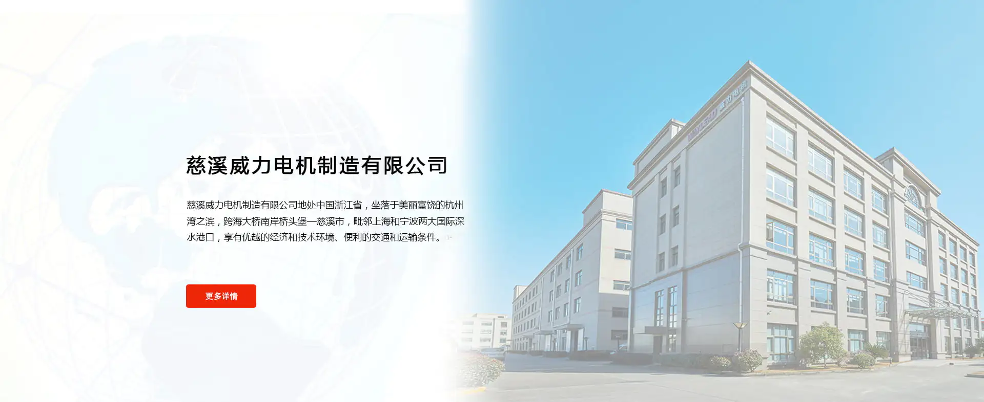 慈溪威力电机制造有限公司地处中国浙江省,坐落于美丽富饶的杭州湾之滨,跨海大桥南岸桥头堡—慈溪市,毗邻上海和宁波两大国际深水港口,享有优越的经济和技术环境、便利的交通和运输条件。