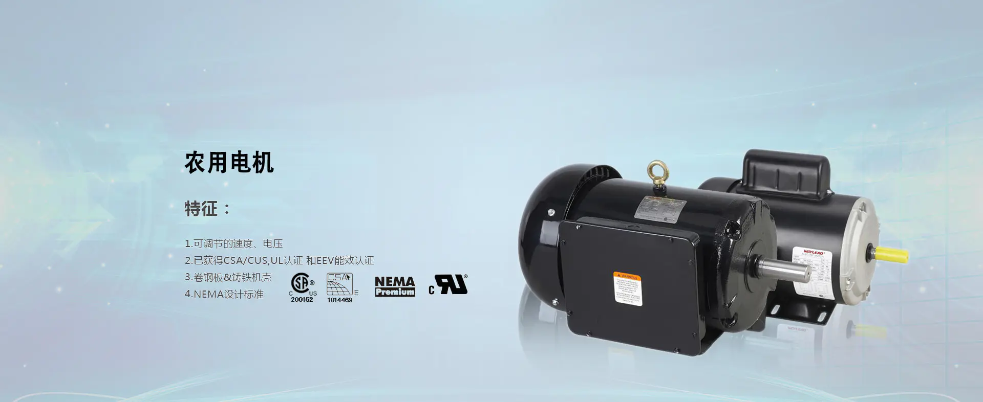 威力电机是“汇丽机电”旗下的原电机分公司,2008年先后在中国、加拿大、美国注册了“WAYLEAD”商标,是一 家集研发、生产、销售和服务于一体的私营企业,国家高新技术企业。